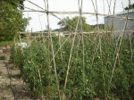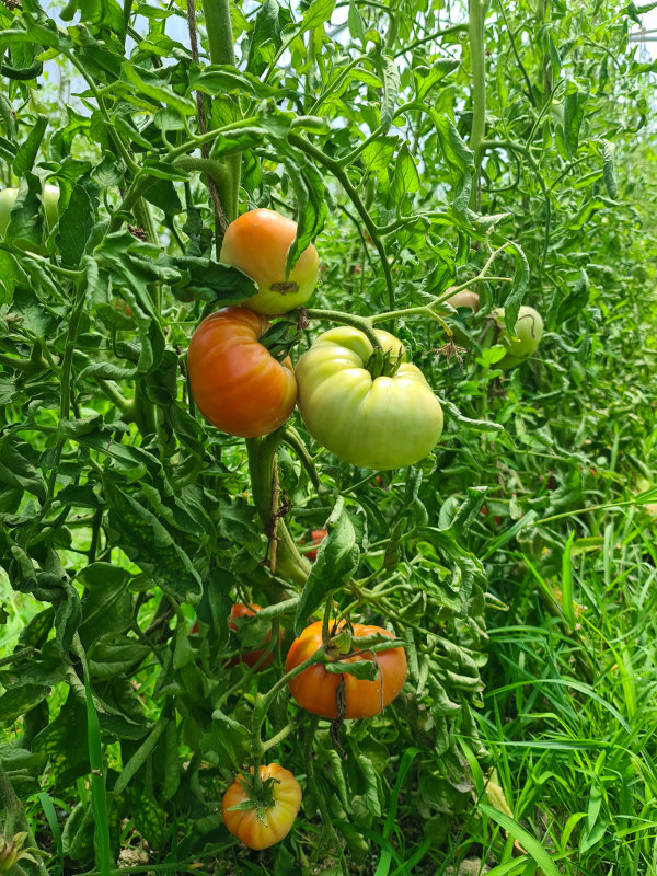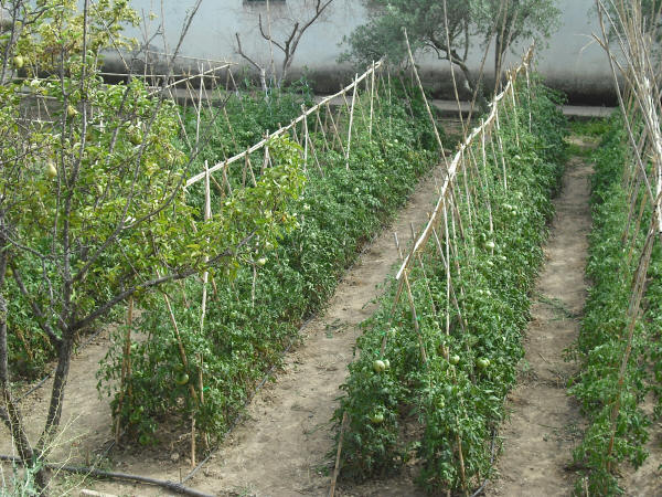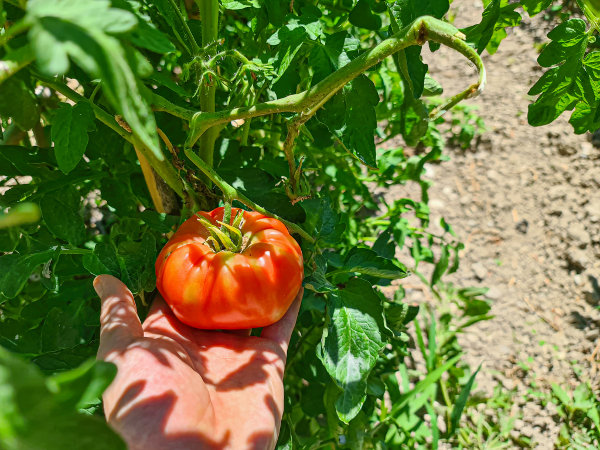 Nuestro Tomate Rosa es una planta de raíces sensibles y su cultivo exige rigurosos cuidados diarios (escardado, desyerbado, atado y empalado ).