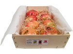 Son de color rosáceo característico, piel muy fina, pulpa suave y compacta, y sobre todo muy aromáticos y de notable sabor. Por su producción y cultivo artesanal presentan distintos tamaños y formas con ligeras imperfecciones que no afectan en absoluto a la calidad.